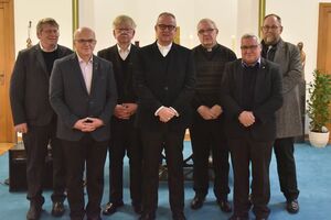 Sechs Ständige Diakone des Erzbistums Paderborn feierten mit Weihbischof Josef Holtkotte in einem Gottesdienst den Jahrestag ihrer Diakonenweihe vor 25 Jahren. V.l.n.r.: Diakon Hubert Berschauer, Diakon Adrian Koczy, Diakon Ferdinand Hegemann, Weihbischof Josef Holtkotte, Diakon Lothar Ommer, Diakon Cataldo Caruso, Diakon Dietmar Fischhofer. Foto: Thomas Throenle / Erzbistum Paderborn
