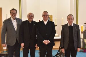 Dankbar für den Dienst der Ständigen Diakone im Erzbistum Paderborn sind Diakon Thomas Huneke als Sprecher der Ständigen Diakone im Erzbistum Paderborn, Pastor Andreas Kreutzmann als Diözesanbeauftragter für den Ständigen Diakonat, Weihbischof Josef Holtkotte sowie Pfarrer Werner Beule als Spiritual für die Ständigen Diakone. Foto: Thomas Throenle / Erzbistum Paderborn